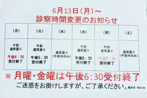 2022年6月13日(月)からの午前の診療時間の変更はありませんが、午後の診療時間の受付時間が変更になります。 月曜日と金曜日の最終受付時間は6時30分迄、 火曜日と木曜日の最終受付時間は引き続き5時30分までとさせて頂きますのでお間違えのないよう宜しく…